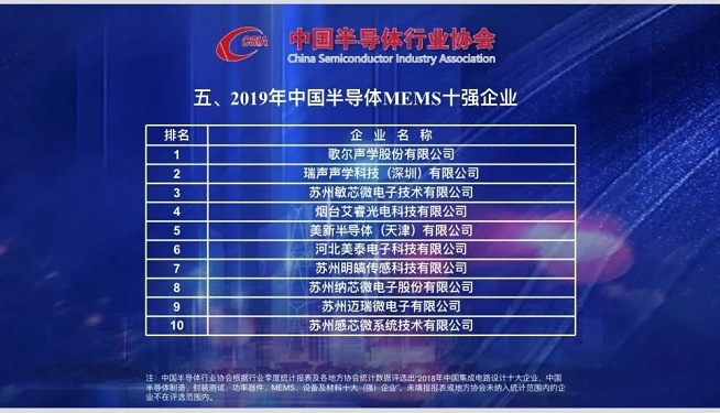 大会上,中国半导体协会正式发布了『2019年中国半导体十大(强)企业』名单,纳芯微电子继去年获评为2018年度中国半导体MEMS十强后,再度荣膺“中国半导体MEMS十强企业”。