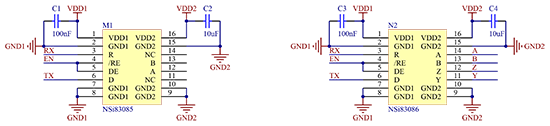 只要有光耦隔离存在,就会有使用寿命短、抗共模能力弱、功耗高等缺点,仍极大的限制电路使用场景,而隔离电路全部使用数字隔离器能很好的避免这些问题。下面是使用NSi8131N1芯片实现的485隔离电路。
